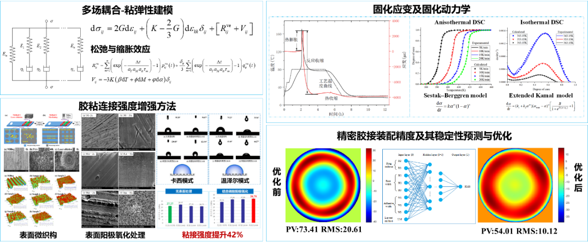 开展了胶粘连接力学和胶粘剂固化动力学、胶接装配工艺多场耦合-粘弹性建模仿真、胶粘连接强度增强方法、胶接装配微变形检测方法、精密光机电产品胶接装配精度及其稳定性预测与优化、精密涂胶技术等研究。