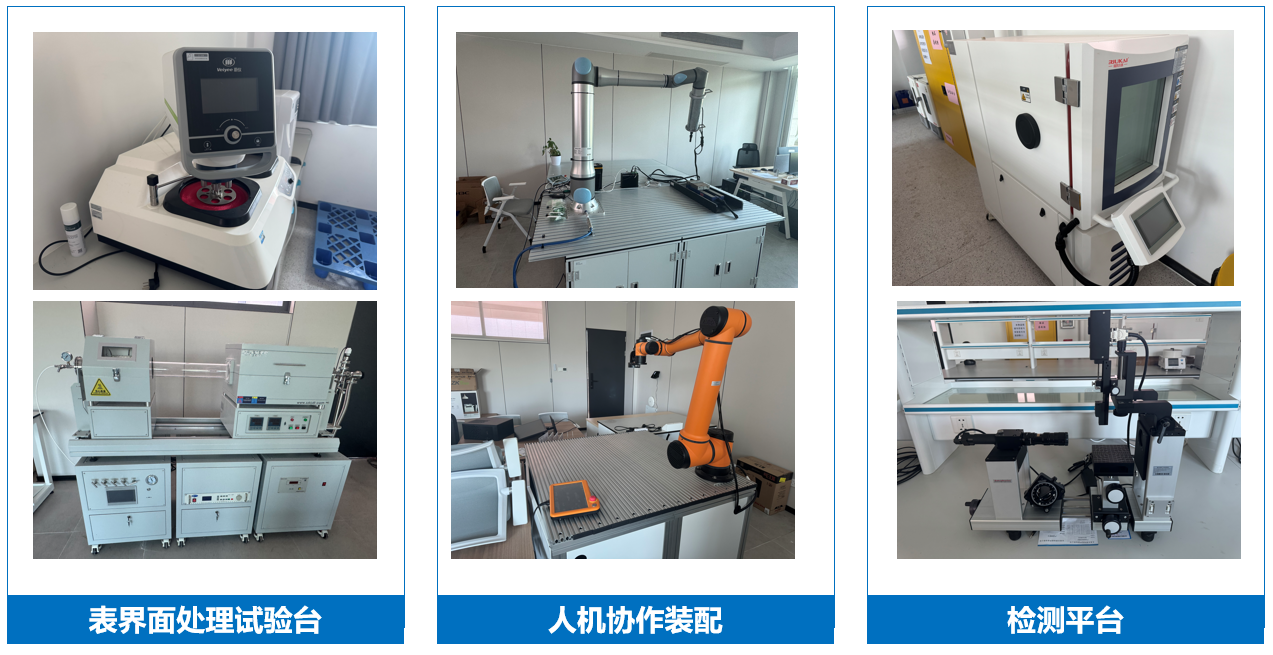 主要设备包括:接触角测量仪、综合试验系统、万能试验机、仿真工作站主机、智能点胶机、高速摄像机、装配现场管控处理终端系统、多目视觉管路测量仪、温度控制箱、光学金相显微镜、固化收缩率测试仪、螺栓装配扭拉试验机等试验和检测设备。