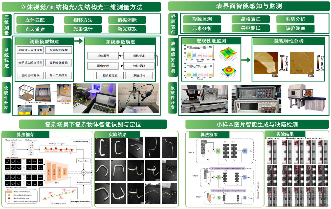 面向复杂装配环境下几何量、物理量以及装配界面电学状态的高精度原位实时感知需求,融合单目/双目视觉、结构光点云重构、激光大视场测距等光学测量技术与基于电磁感应、静电力作用的界面微观电磁性质表征方法,结合深度学习等智能算法,构建从二维图像到三维形貌、从宏观几何形貌到微观界面电学行为的多模态测量与传感体系,解决强反光、大曲率、自遮挡等复杂场景下的测量难题,以及传统方法无法获取表界面电学性质微观分布的关键问题。