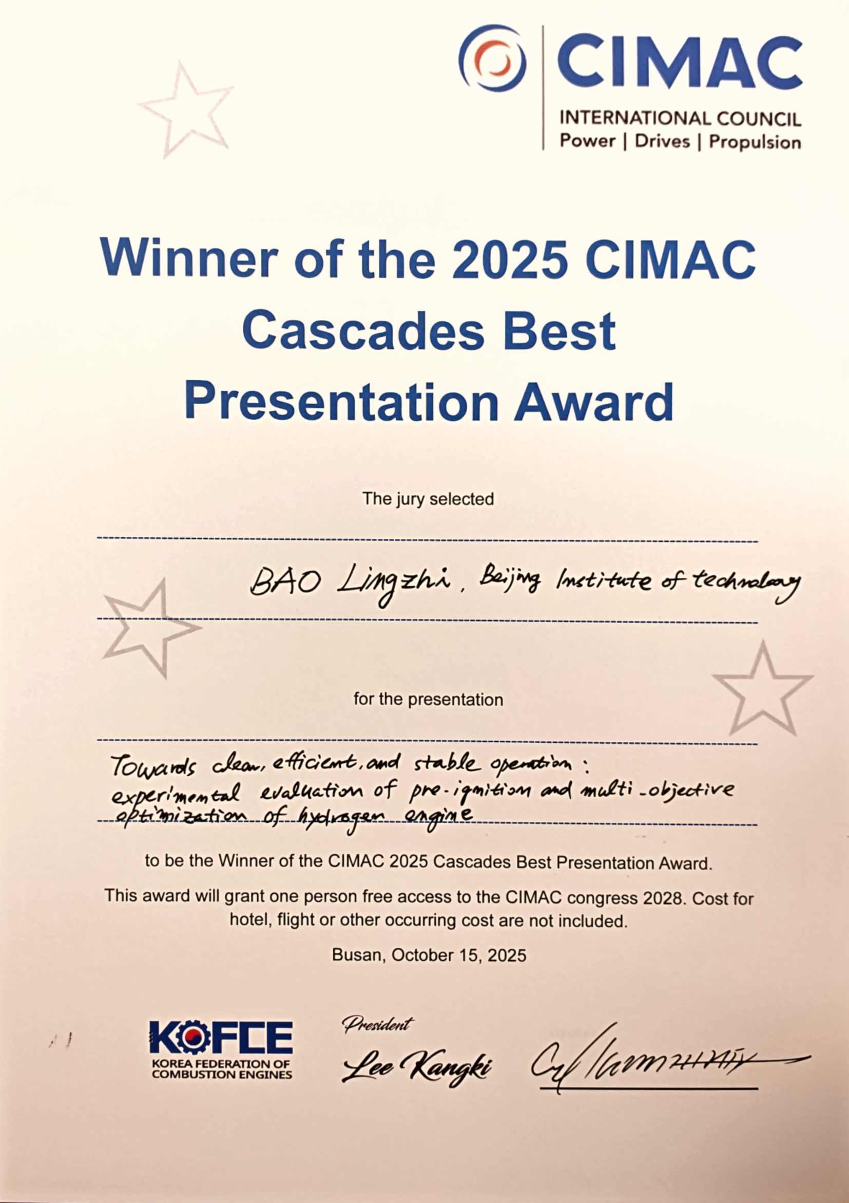 2025年10月14日至15日,国际内燃机协会(CIMAC)第十五届国际青年工程师论坛(15th CIMAC CASCADES)在韩国釜山成功举办。2138CC太阳集团博士后包凌志凭借在氢发动机领域的研究报告,斩获本届论坛唯一的“最佳报告奖”,成为该奖项设立以来首位来自中国的获奖者。