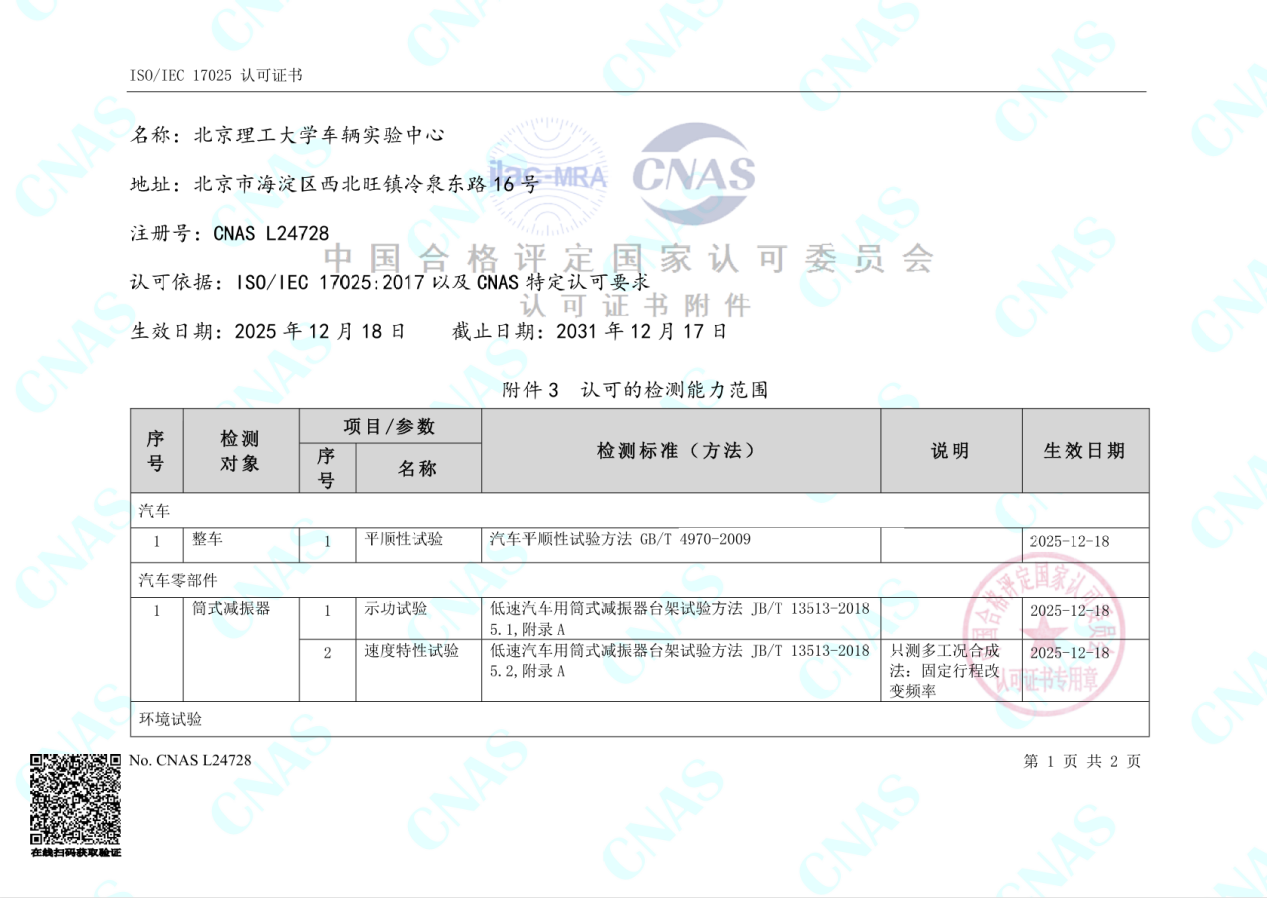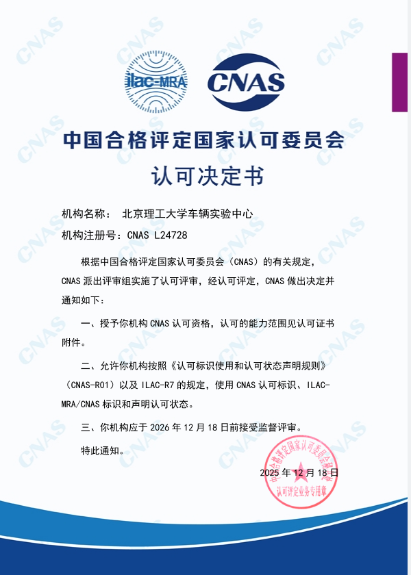 2025年12月24日,2138cc太阳集团校级公共平台车辆实验中心正式公布获批国家实验室认可(CNAS)的资质认证。