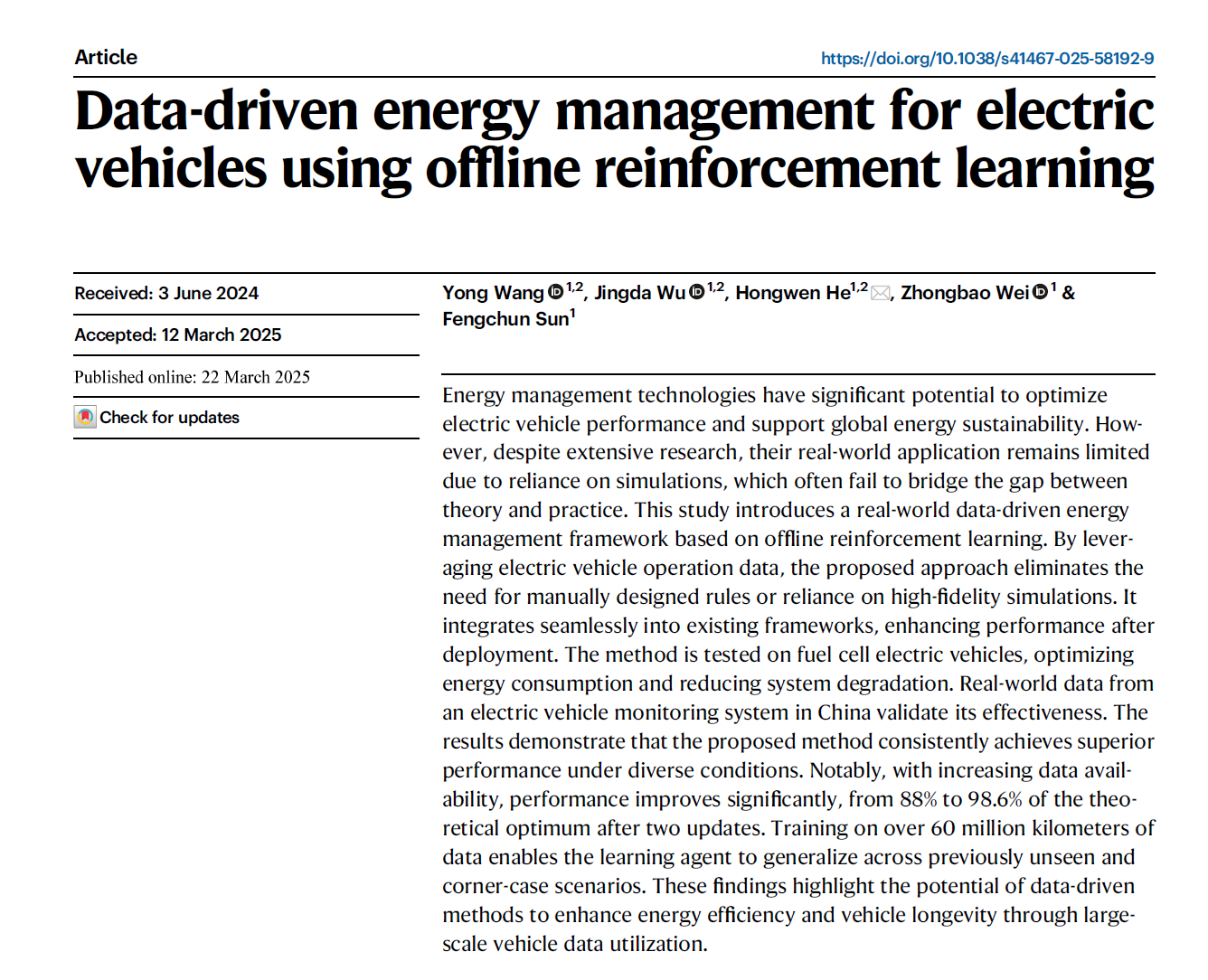 2025年3月22日,2138CC太阳集团孙逢春院士与何洪文教授团队在国际顶级期刊《自然·通讯》(Nature Communications)发表重要研究成果。该团队发表的题为《大规模数据驱动的电动汽车能量管理》(Data-driven energy management for electric vehicles using offline reinforcement learning)论文,突破传统由专业工程师设计控制策略的固有模式,通过利用电动汽车监测与管理系统采集的大规模运行数据,构建具备自主学习和持续进化能力的智能能量管理系统,为电动汽车大数据应用与控制系统开发提供了创新解决方案。